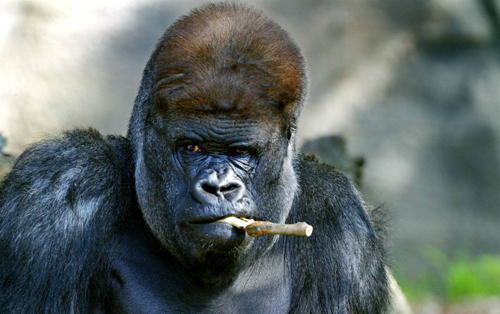Доминантный самец гориллы Кибабу жует палку в зоопарке Таронга в Сиднее