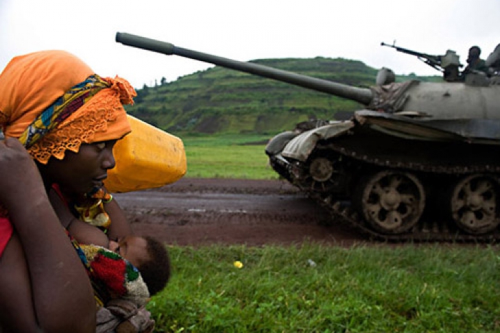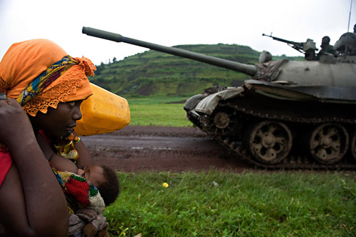 Конголезка с ребенком на руках и вещами проходит мимо танка конголезской армии недалеко от Кибумбы, приблизительно в 35 км к северу от провинциального городка Гома 27 октября 2008 года