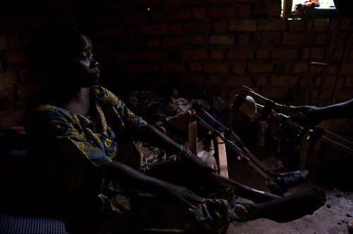 Конголезке помогают воспользоваться протезами в ее доме в Буниакири 11 марта 2009 года