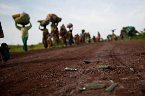 Беженцы проходят мимо разбросанных на дороге гильз, покидая Кибати и направляясь к своим деревням Кибумба и Ругари 2 ноября 2008 года