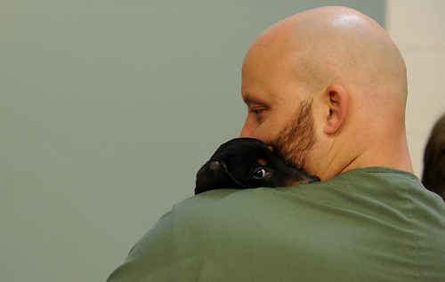 Работник приюта Джонатан Рогг держит напуганного 4-месячного щенка таксы