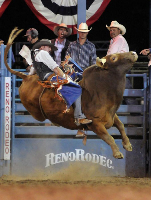 Джесси Бейл за секунду до падения с быка на родео в Рино, штат Невада