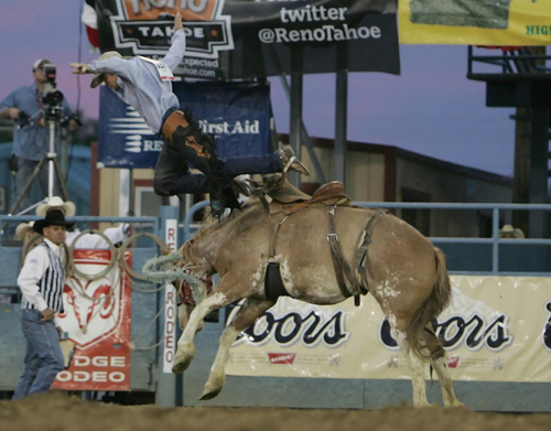 Джейс Гарретт в полете с мустанга на родео в Рино, 20 июня