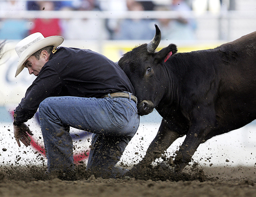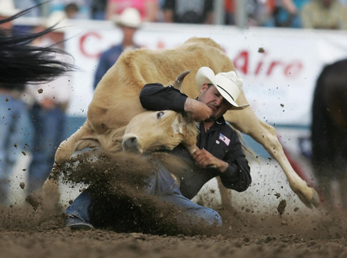 В «Ассоциацию профессионалов родео» США входят более 5 тысяч членов. На фото: ковбой Люк Бранкино из Калифорнии пытается завалить быка на соревнованиях в Рино