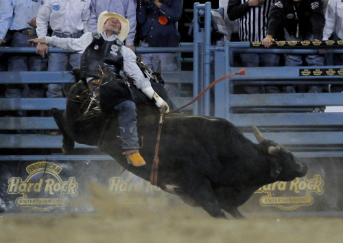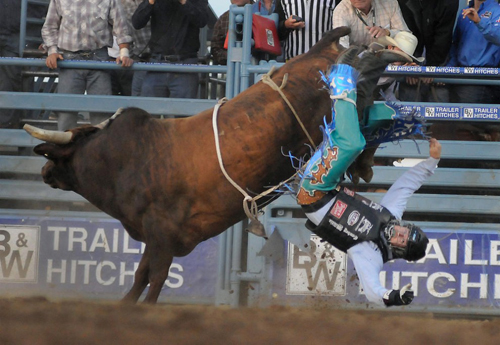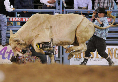 Падение Колина МакТаггарта из Невады с быка во время родео в Рино. В результате падения ковбой получил серьёзные повреждения