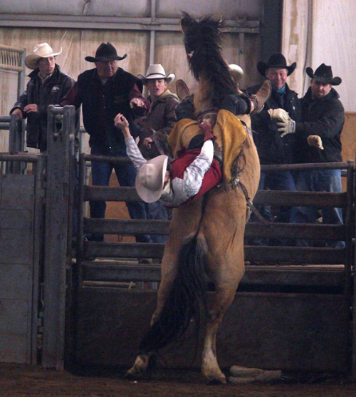Для того чтобы кони вставали на дыбы, на них надевают специальный ремень, который впивается в круп лошади и передавливает очень чувствительный нерв. Пытаясь освободиться из причиняющих мученья ремней, лошади брыкаются изо всех сил и сбрасывают сидящих на них наездников.