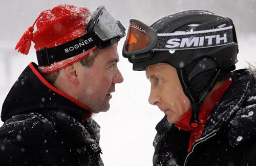 На фото Медведев и Путин общаются друг с другом на популярном центре горнолыжного спорта – базе отдыха «Красная поляна». Согласно материалам сайта Wikileaks, в 2008 г. один из сотрудников посольства США в России в закрытой дипломатической переписке сравнивал их сотрудничество с совместной работой знаменитых героев комиксов Бэтмена и Робина.