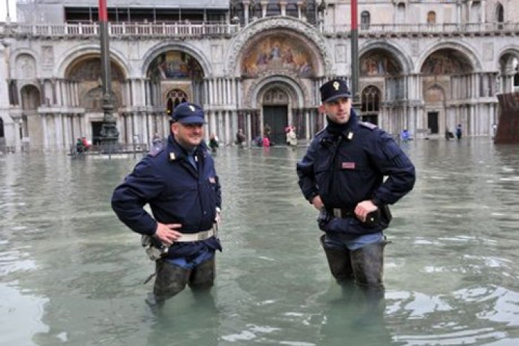 Проливные дожди привели к наводнению и в Венеции. Затоплен практически весь старый город, по улицам которого теперь плавают аквалангисты и бродят полицейские в рыбацких сапогах.
