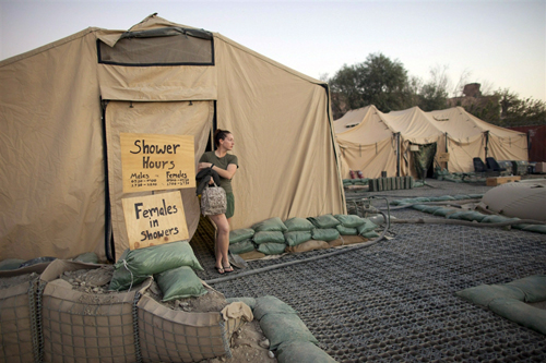 В небольшом лагере живут 269 мужчин и всего 3 женщины, и у женщин-солдат есть только один час в день (30 минут утром и 30 – вечером), чтобы принять душ