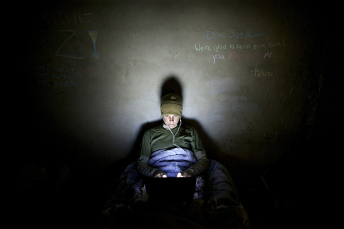 Сержант Шина Адамс работает над отчетами на ноутбуке поздно ночью в лагере в Муса Кала