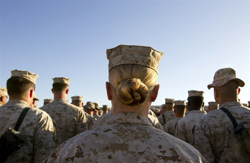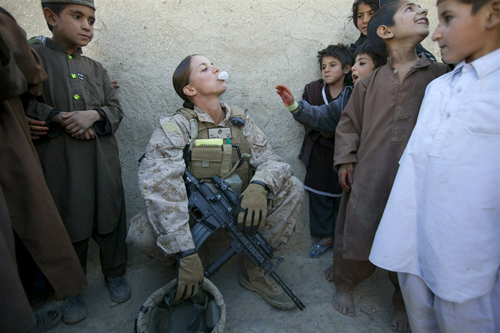 Сержант Кристал Гроувс из женского подразделения первого батальона на церемонии в честь 235-го дня рождения морпехов 10 ноября в лагере Деларам в провинции Гильменд. На неспокойных границах Афганистана сейчас зарегистрировано 48 женщин-военнослужащих в составе женского подразделения помощи. Женщины, добровольно записывающиеся на службу, которая длится 6,5 месяцев, проходят 10-месячный курс в лагере Пенделтон в Калифорнии, где их обучают поведению в различных ситуациях.