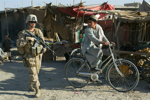 22-двухлетняя санитарка Шеннон Кроули патрулирует рынок в Муса Кала, проходя мимо мальчика на велосипеде