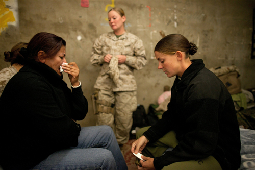 Сержант Шина Адамс (справа) успокаивает афганскую переводчицу (слева), узнавшую о смерти коллеги, в Муса Кала