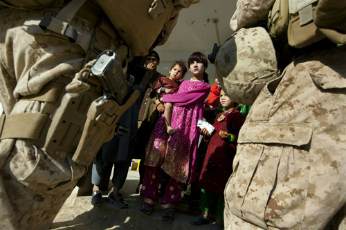 25-летняя сержант Шина Адамс развлекает афганских мальчишек, надувая пузыри, во время патрулирования Муса Калы
