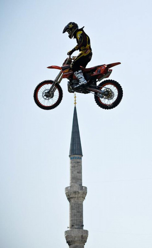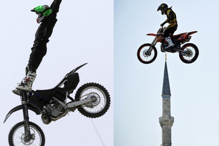 Прыжок немецкого байкера на фоне одного из шести минаретов Голубой мечети в Стамбуле