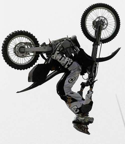 Спортсмен из Колорадо выполняет красивый и очень опасный трюк под названием «Поцелуй смерти». При идеальном исполнении этого трюка спортсмен и мотоцикл должны вытянуться в вертикальную линию.