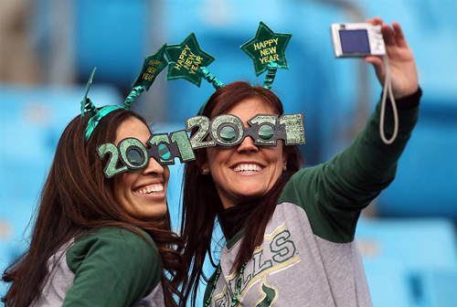 Фанатки команды Университета Южной Флориды «Быки» фотографируются на трибунах во время матча против команды «Тигры из Клемсона» в пятницу в Шарлотте, Северная Каролина