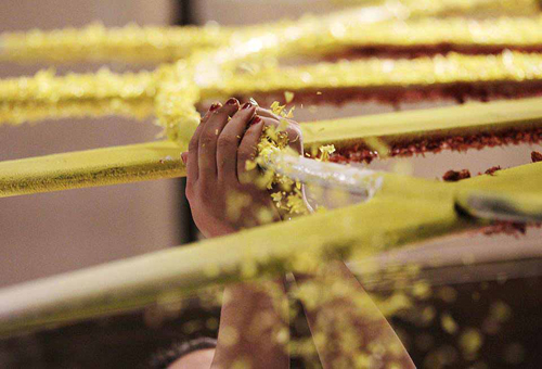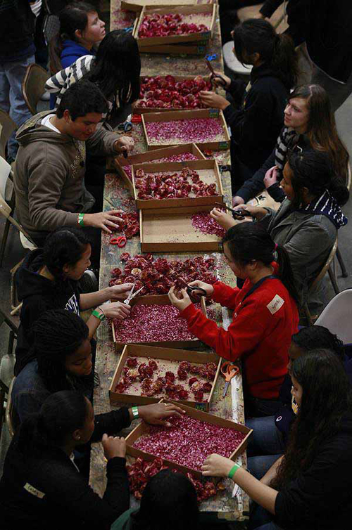 Парад Роз не зря носит такое название - во время этого праздника используется огромное количество цветов. На фото: добровольцы разрезают цветки на лепестки, которые позже будут разбрасываться во время парада.