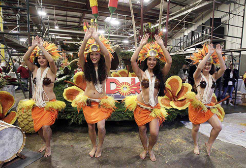 В параде участвуют не только представители Пасадены, но и люди и компании из других городов, а иногда даже и стран. На фото: 29 декабря в городе Ирвиндейл, штат калифорния Гавайские танцовщицы репетируют рядом с платформой под названием «Хорошо жить в раю», которую представляет компания Dole, крупнейший в мире поставщик бананов и других свежих фруктов.