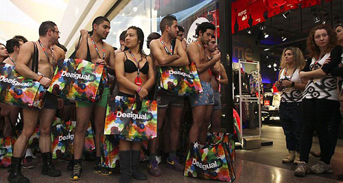 Согласно правилам объявленной ранее промоакции, каждый из ста посетителей, взявших на себя смелость прийти в нижнем белье в мадридский магазин бренда «Desigual» смог бесплатно получить два предмета одежды: верх и низ.