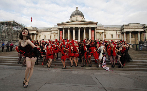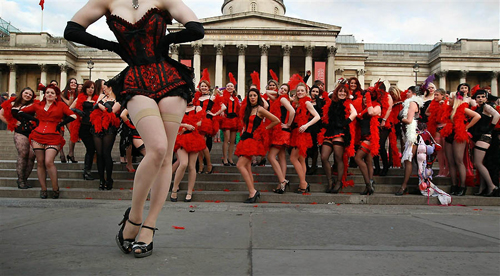 Девушки в течение пяти минут танцевали совместный бурлеск-танец, демонстрируя свое искусство жюри, прессе и многочисленным зевакам, которые собрались на Трафалгарской площади