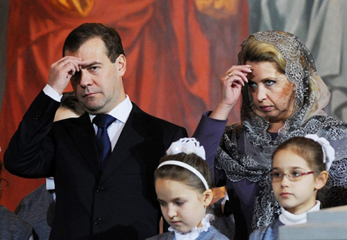 Президент России Дмитрий Медведев с супругой во время рождественской службы в Храме Христа Спасителя